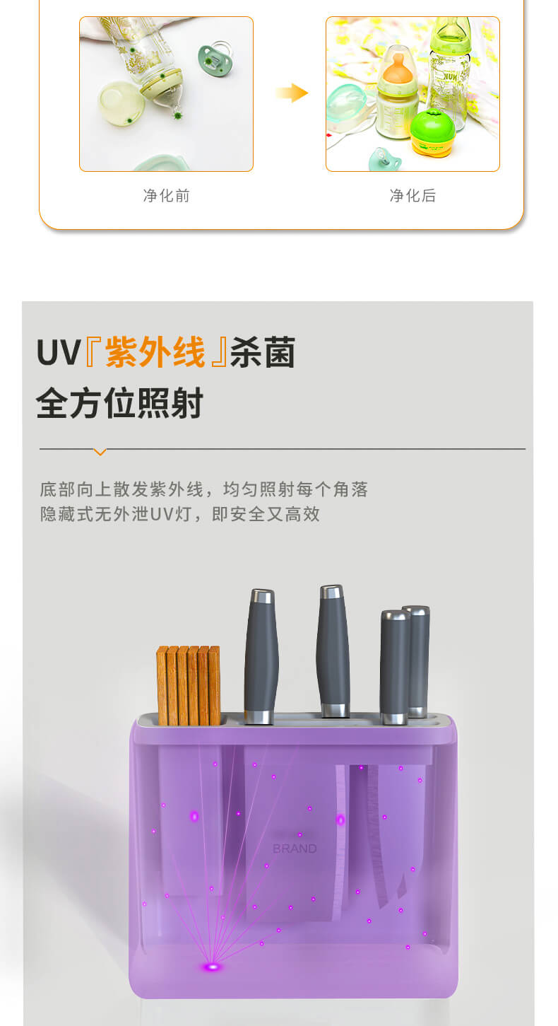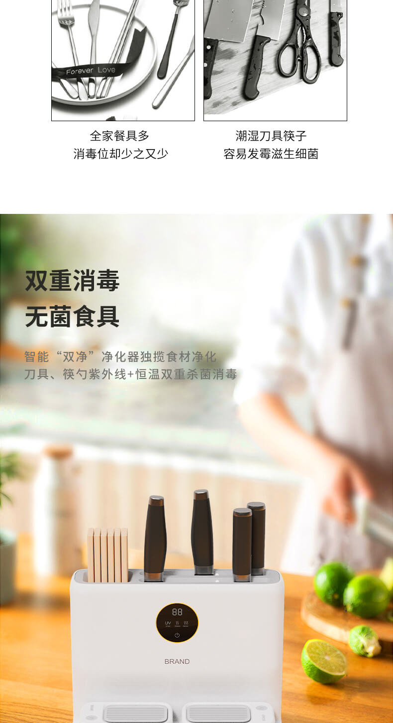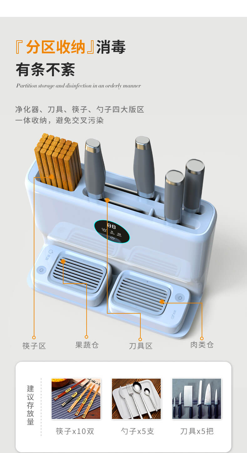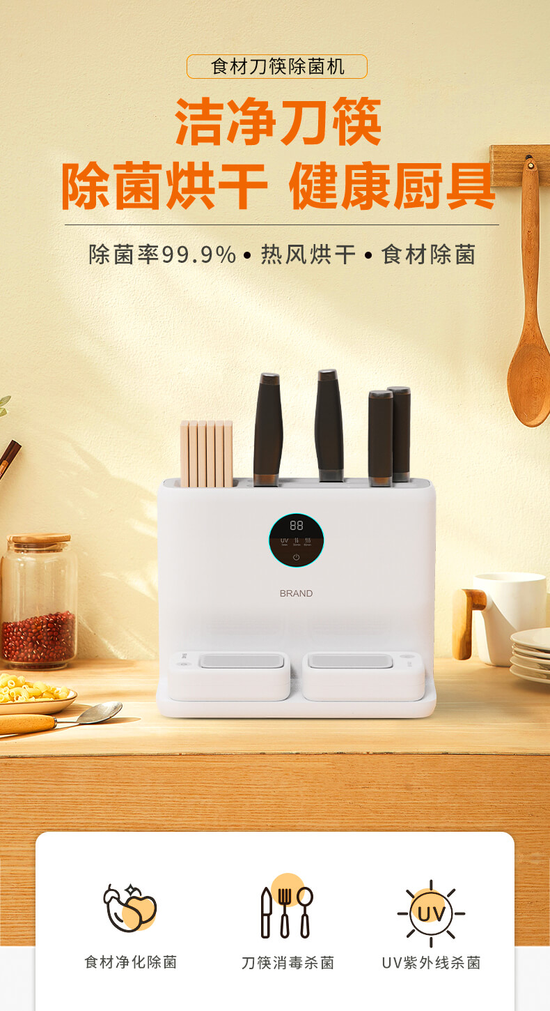 四、隱藏式無外泄UV燈,徹底消殺刀具、筷勺隱藏細(xì)菌,雙重烘干系統(tǒng),保障刀具筷勺不留水漬,抑制霉菌、細(xì)菌等有害物質(zhì)滋生;