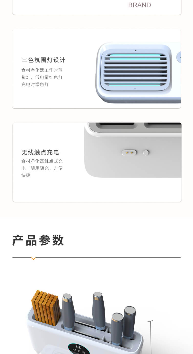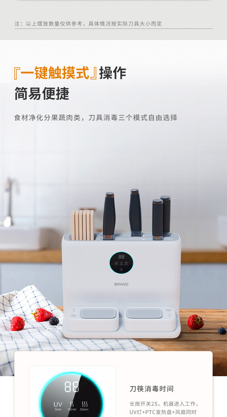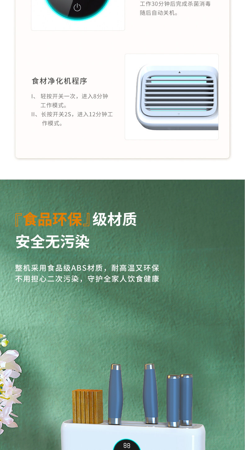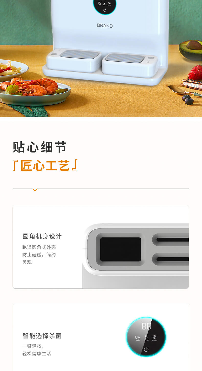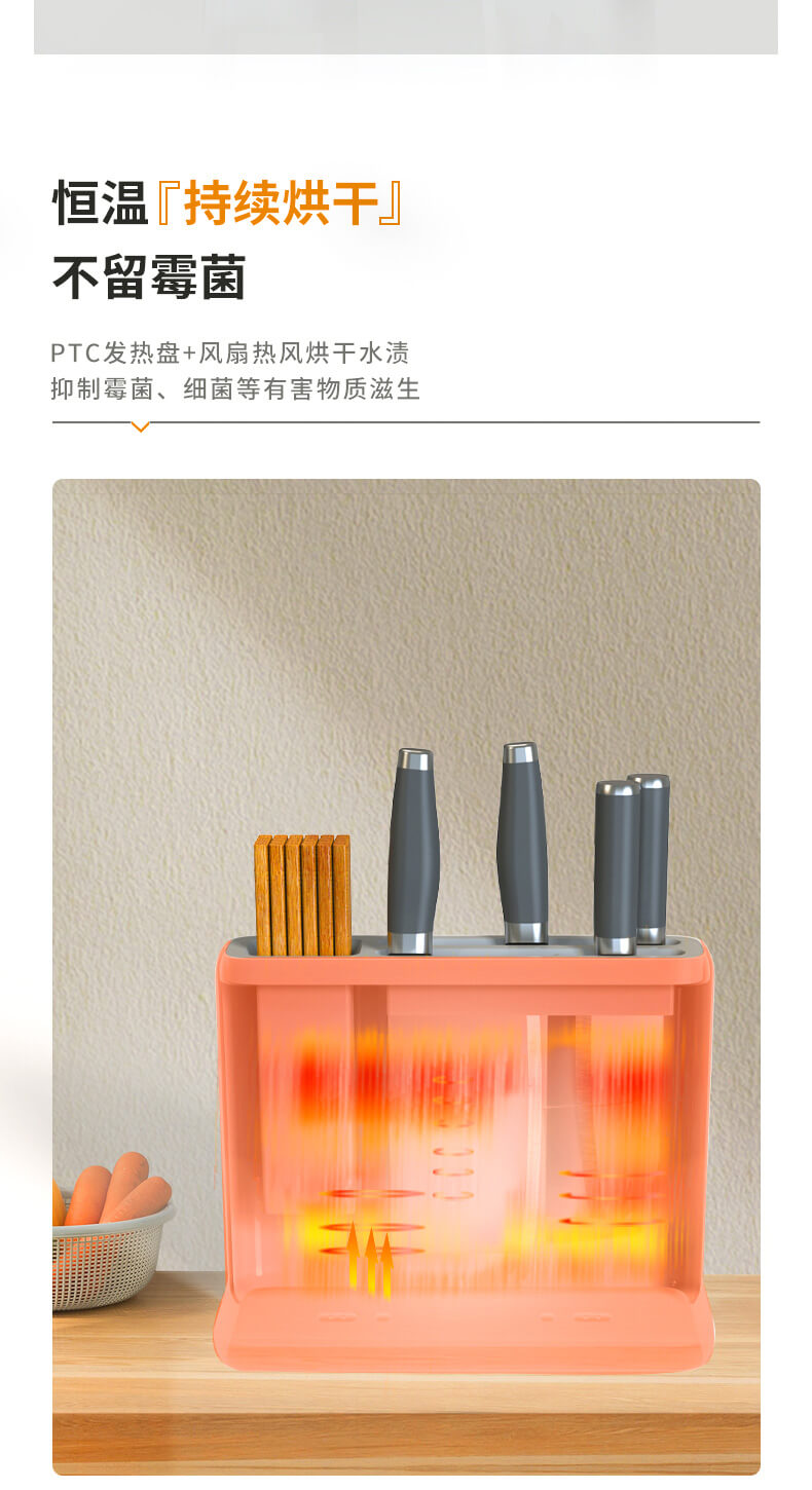 四、隱藏式無外泄UV燈,徹底消殺刀具、筷勺隱藏細(xì)菌,雙重烘干系統(tǒng),保障刀具筷勺不留水漬,抑制霉菌、細(xì)菌等有害物質(zhì)滋生;