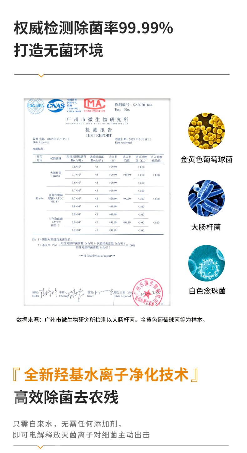 三、無線專用果蔬、肉類發(fā)生器,避免交叉污染,同時(shí)啟動(dòng)省時(shí)高效,廣微測(cè)權(quán)威檢測(cè)認(rèn)證,除菌率高達(dá)99.9%;