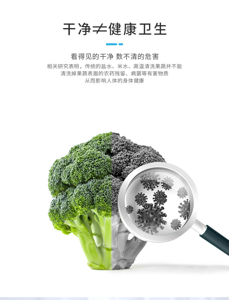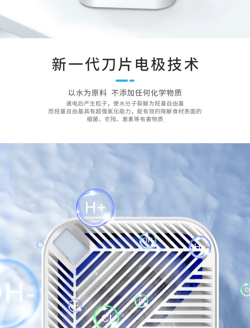 采用新一代刀片電極技術、以水為原料不添加任何化學物質,通電后產生粒子,使水分子裂解為羥基自由基具有強氧化能力,能有效的降解食材表面的細菌、農殘、激素等有害物質。水在離子發生器的作用下分解成OH-和H+;分解的一部分OH-將農藥和細菌細胞壁上的H+奪走并重組,形成無害物質;另一部分OH-和水中氯結合生成次氯酸,通過氧化反應降解殺滅細菌。