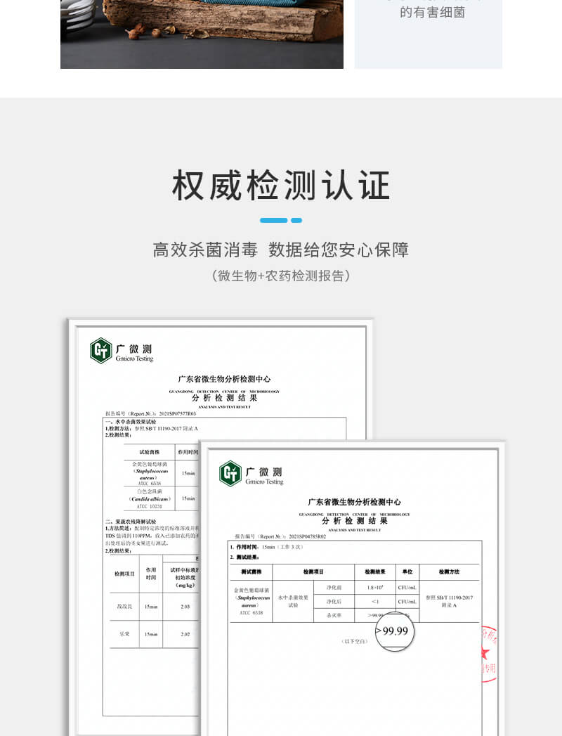 三、廣微測權威檢測認證,除菌率高達99.9%;