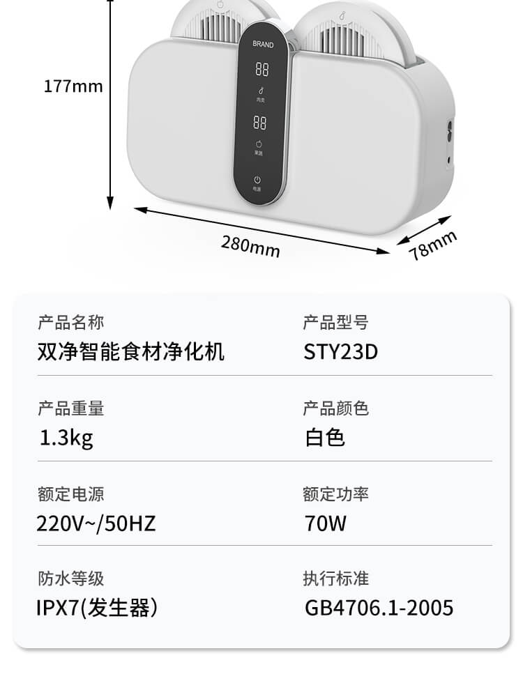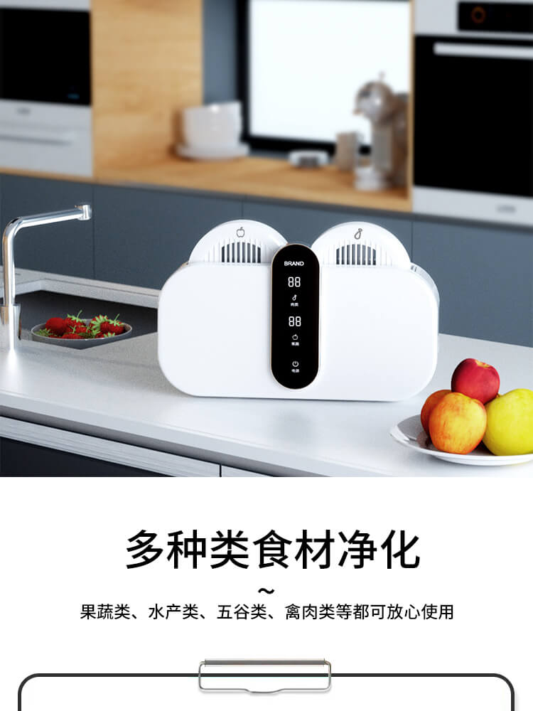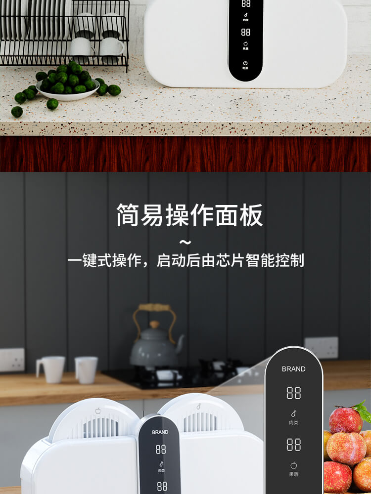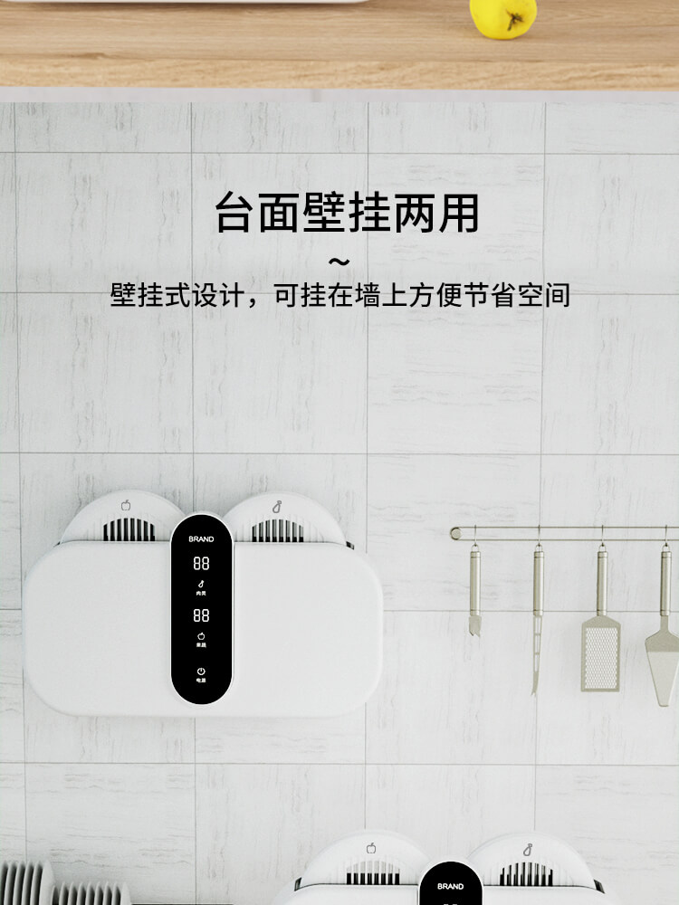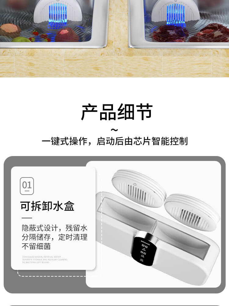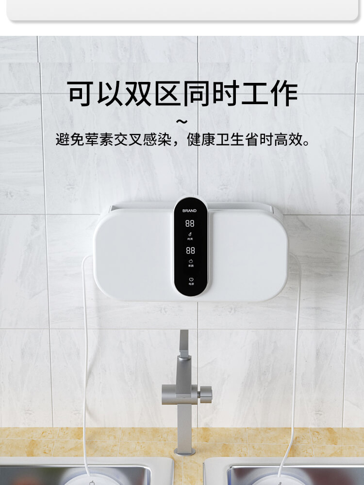 臺面壁掛雙用途,免打孔背膠設計,輕松掛在廚房任意角落,臺面放置小巧不占地方,STY23D雙倉設計,葷素雙凈同時啟動,專用果蔬、肉類點解發生器,避免交叉感染,雙凈同時啟動,省時更高效.