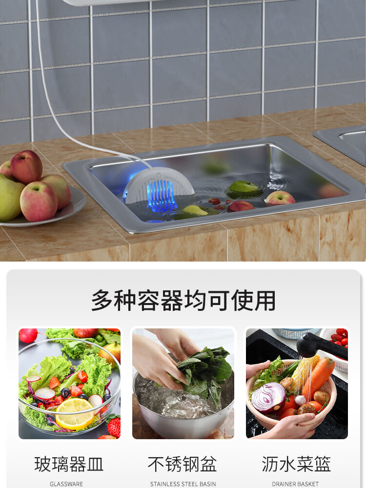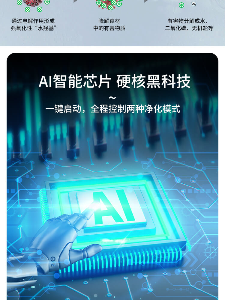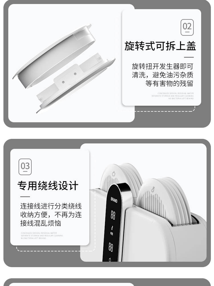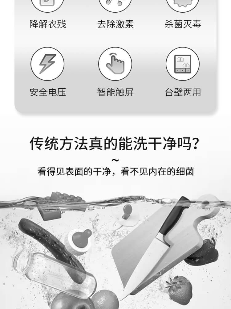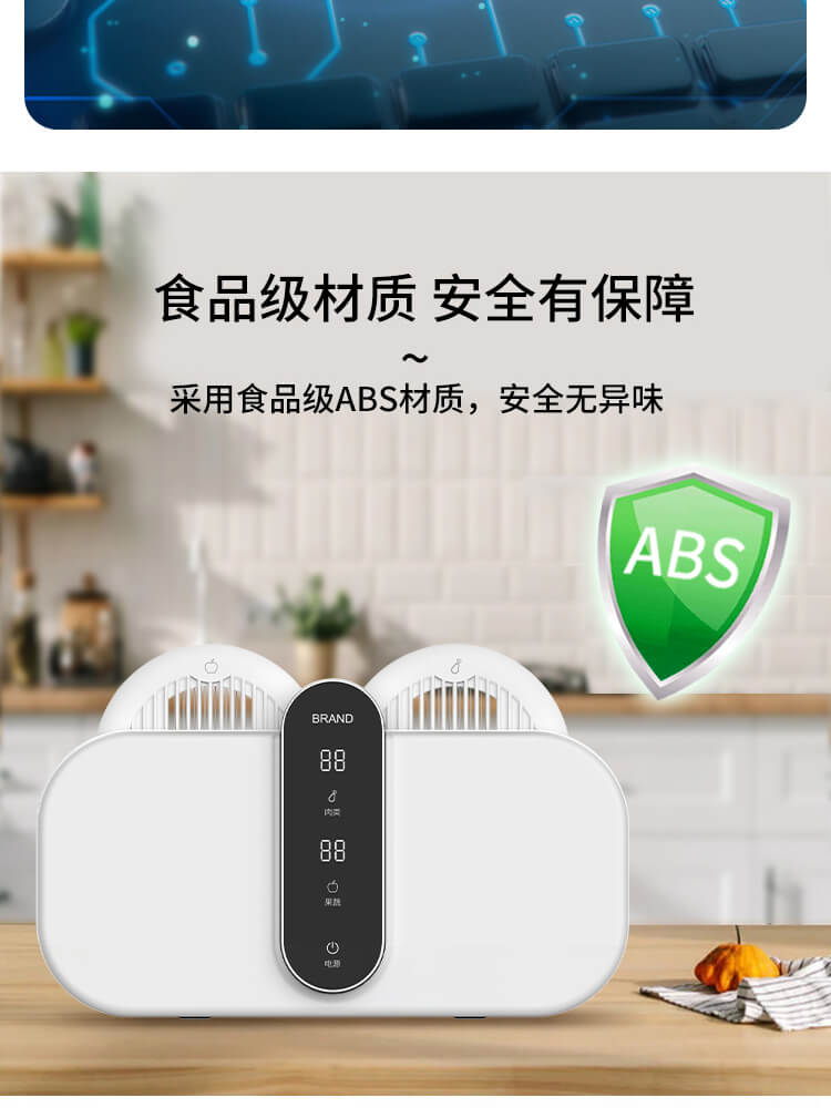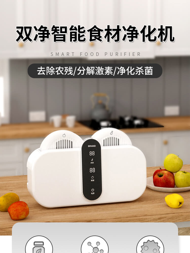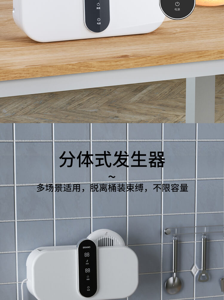 臺面壁掛雙用途,免打孔背膠設計,輕松掛在廚房任意角落,臺面放置小巧不占地方,STY23D雙倉設計,葷素雙凈同時啟動,專用果蔬、肉類點解發生器,避免交叉感染,雙凈同時啟動,省時更高效.