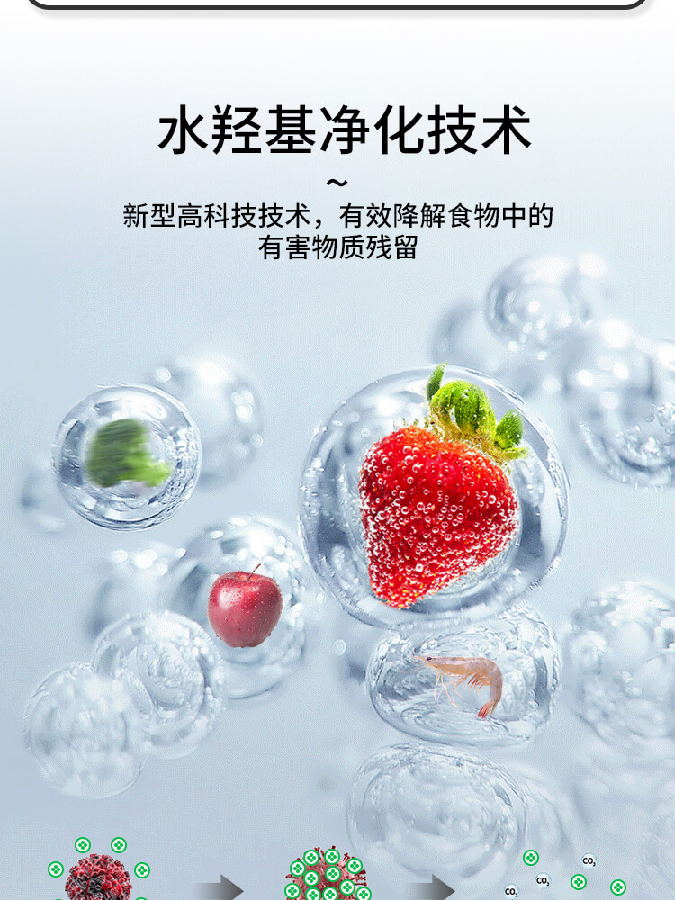 STY23D果蔬清洗凈化機采用加強刀片電極凈化技術、航天級鈦合材質,以水為原料不添加任何化學物質,通電后產生粒子,使水分子裂解為羥基自由基具有強氧化能力,能有效的降解食材表面的細菌、農殘、激素等有害物質。水在離子發生器的作用下分解成OH-和H+;分解的一部分OH-將農藥和細菌細胞壁上的H+奪走并重組,形成無害物質;另一部分OH-和水中氯結合生成次氯酸,通過氧化反應降解殺滅細菌。