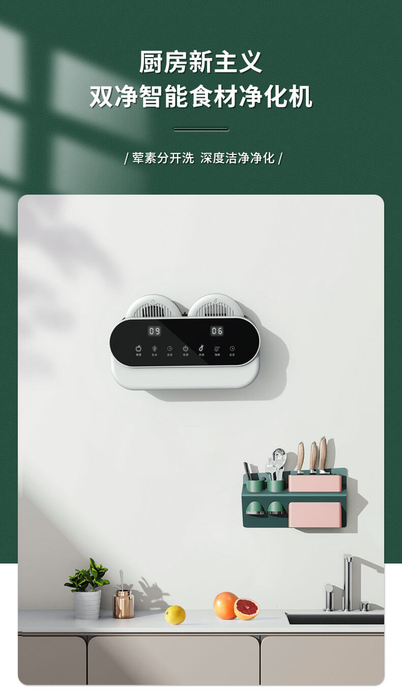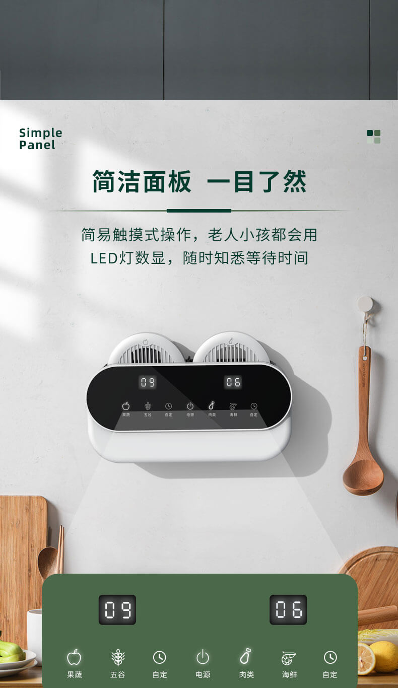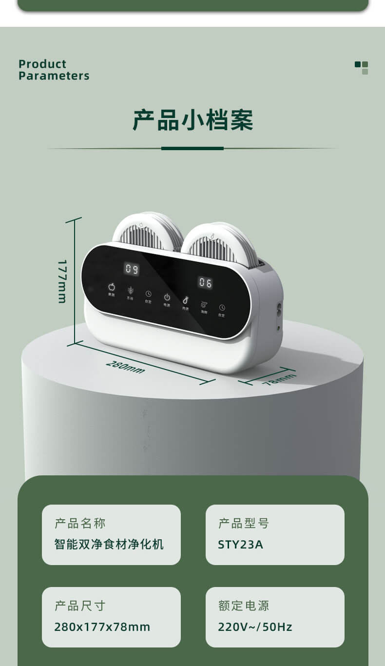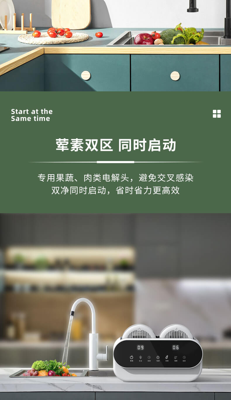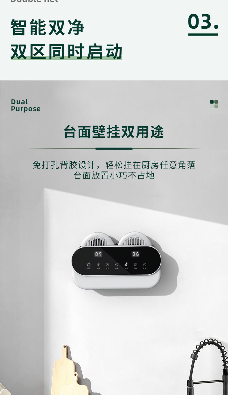 臺面壁掛雙用途,免打孔背膠設計,輕松掛在廚房任意角落,臺面放置小巧不占地方,STY23A雙倉設計,葷素雙凈同時啟動,專用果蔬、肉類點解發生器,避免交叉感染,雙凈同時啟動,省時更高效.