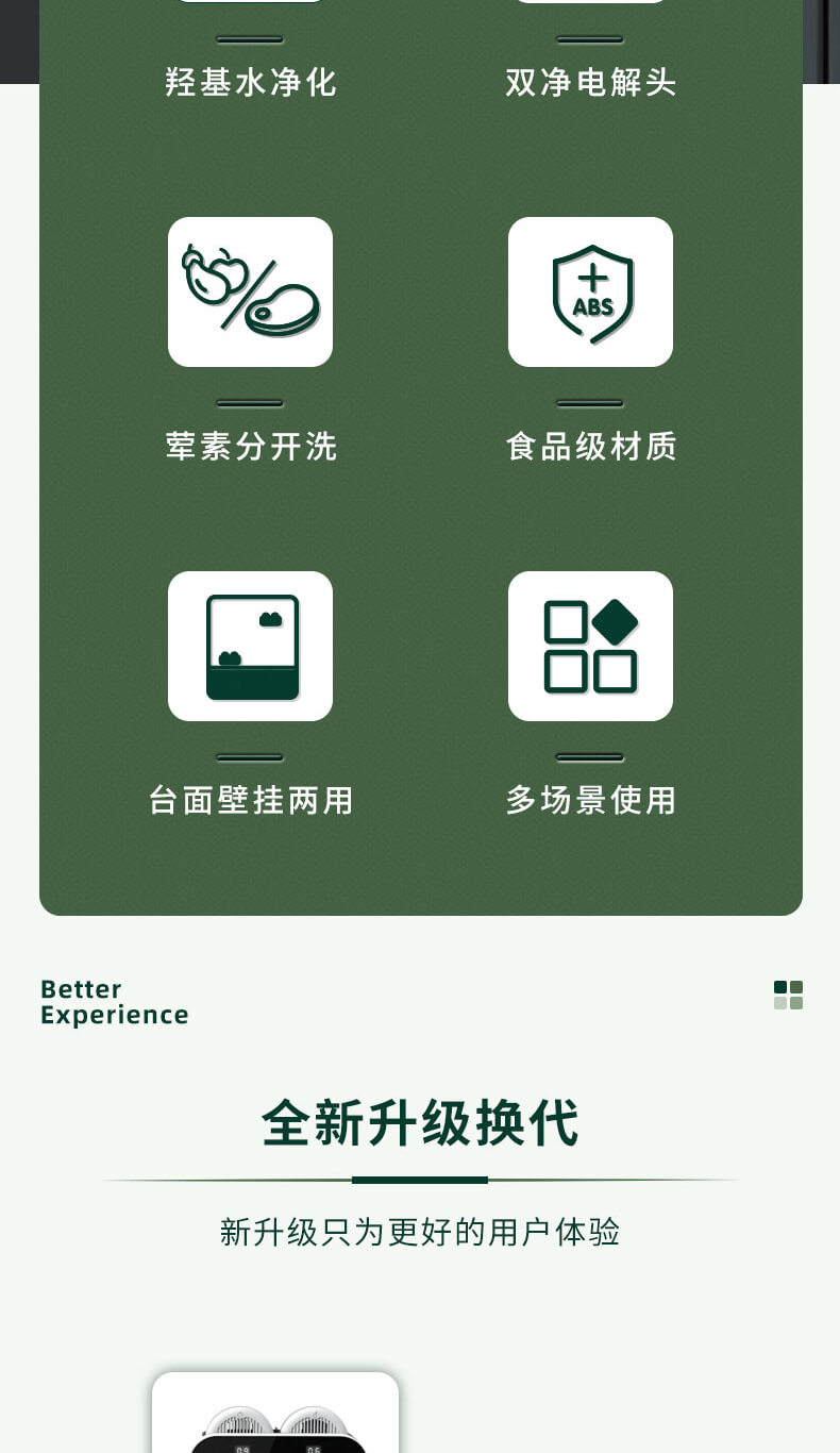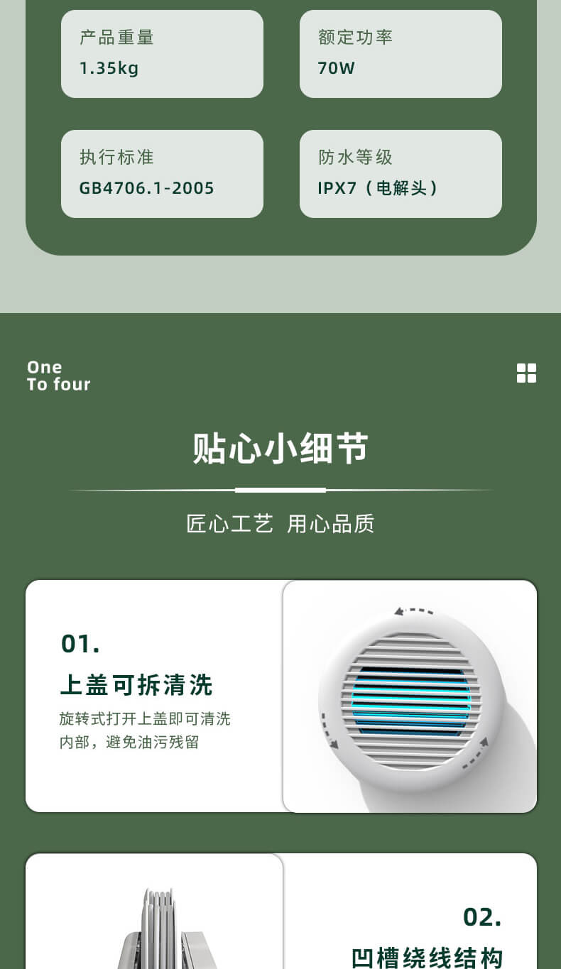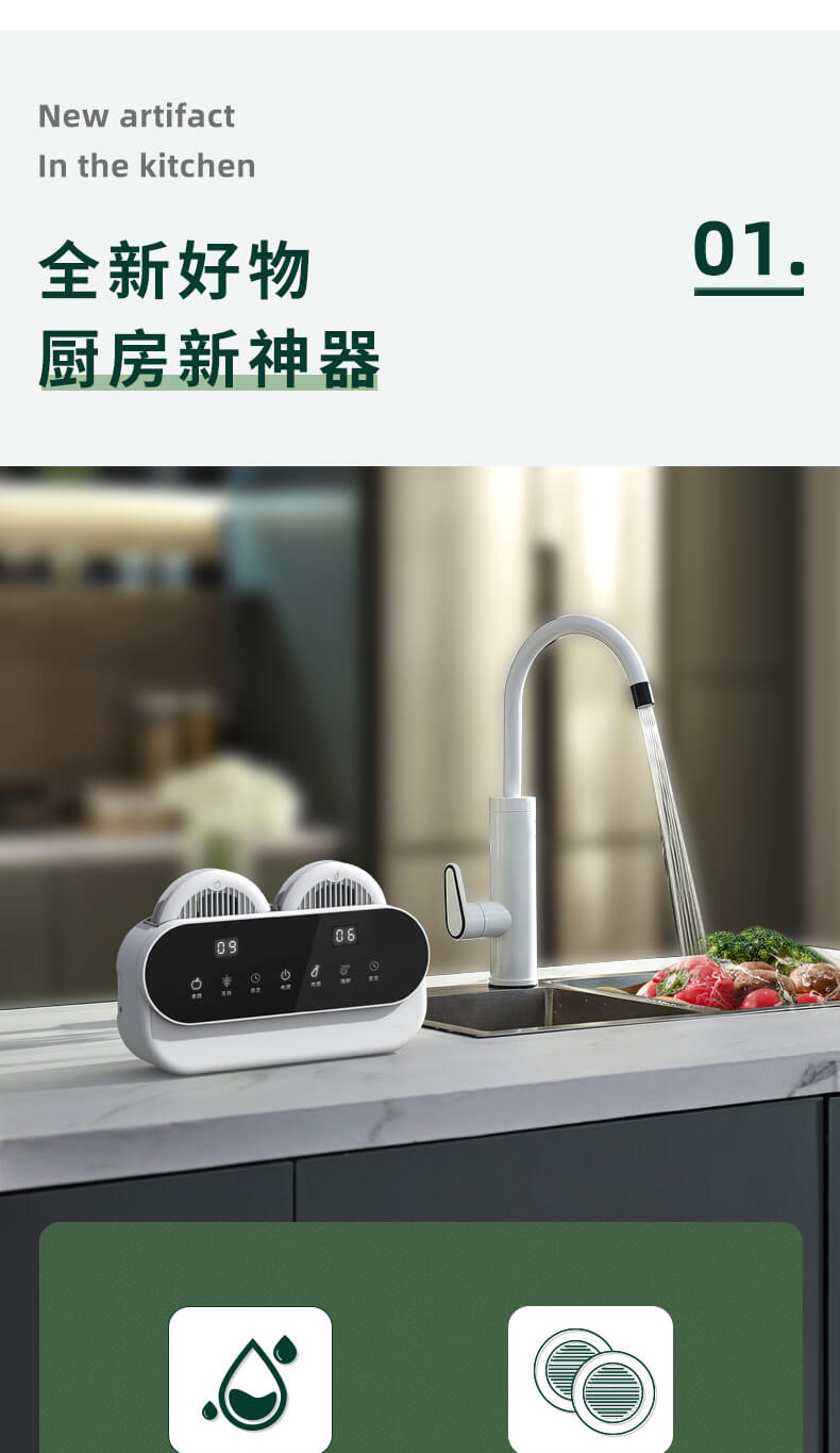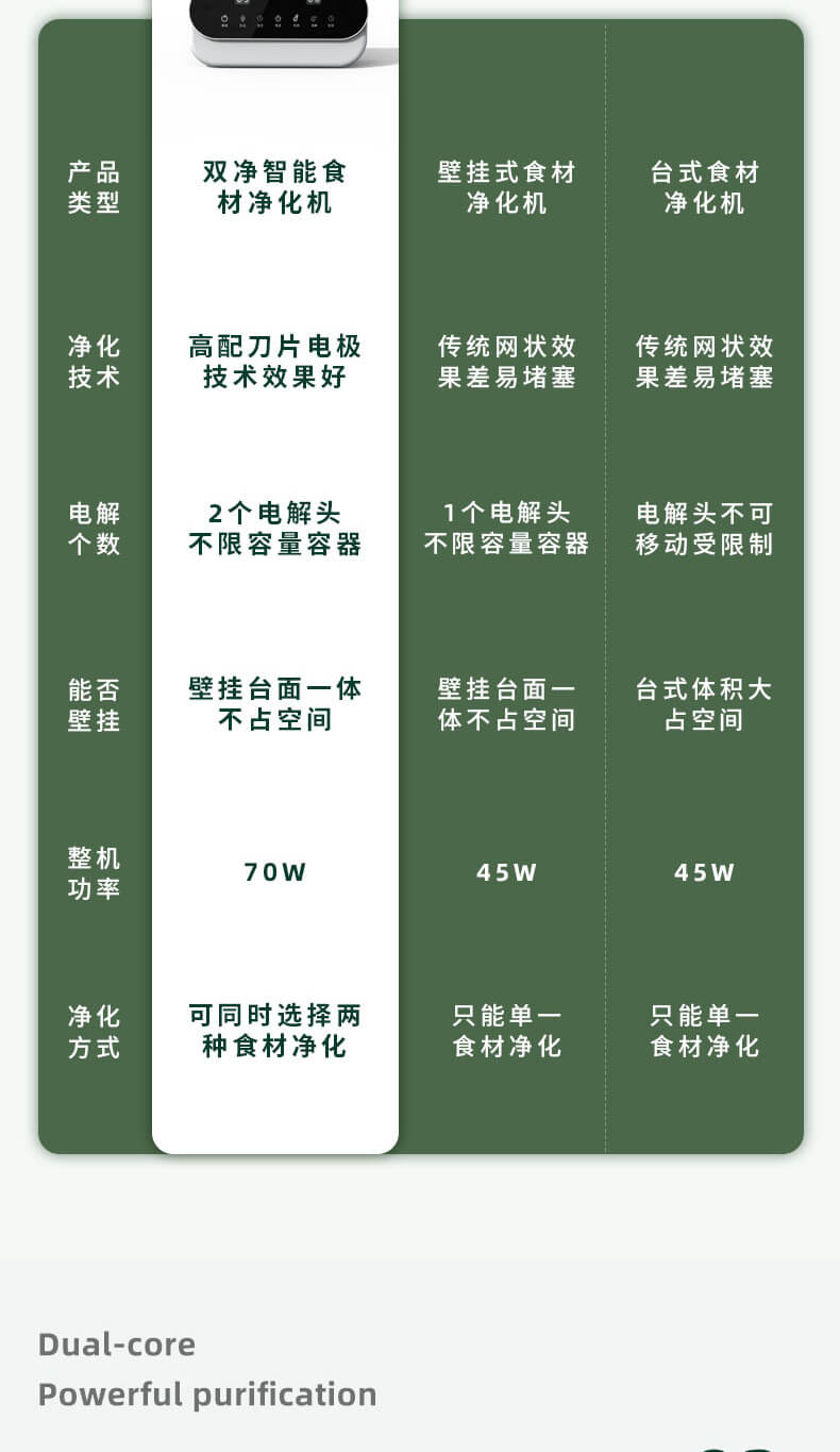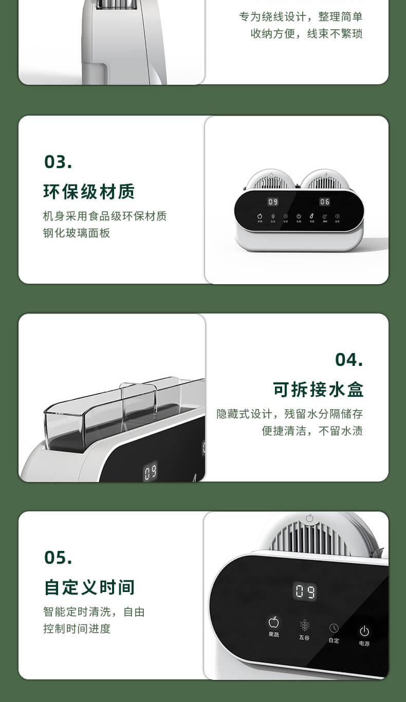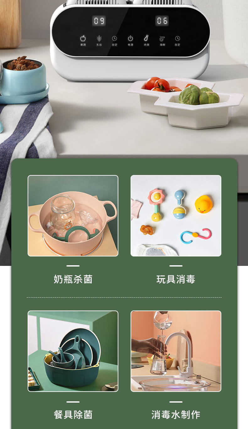 臺面壁掛雙用途,免打孔背膠設計,輕松掛在廚房任意角落,臺面放置小巧不占地方,STY23A雙倉設計,葷素雙凈同時啟動,專用果蔬、肉類點解發生器,避免交叉感染,雙凈同時啟動,省時更高效.