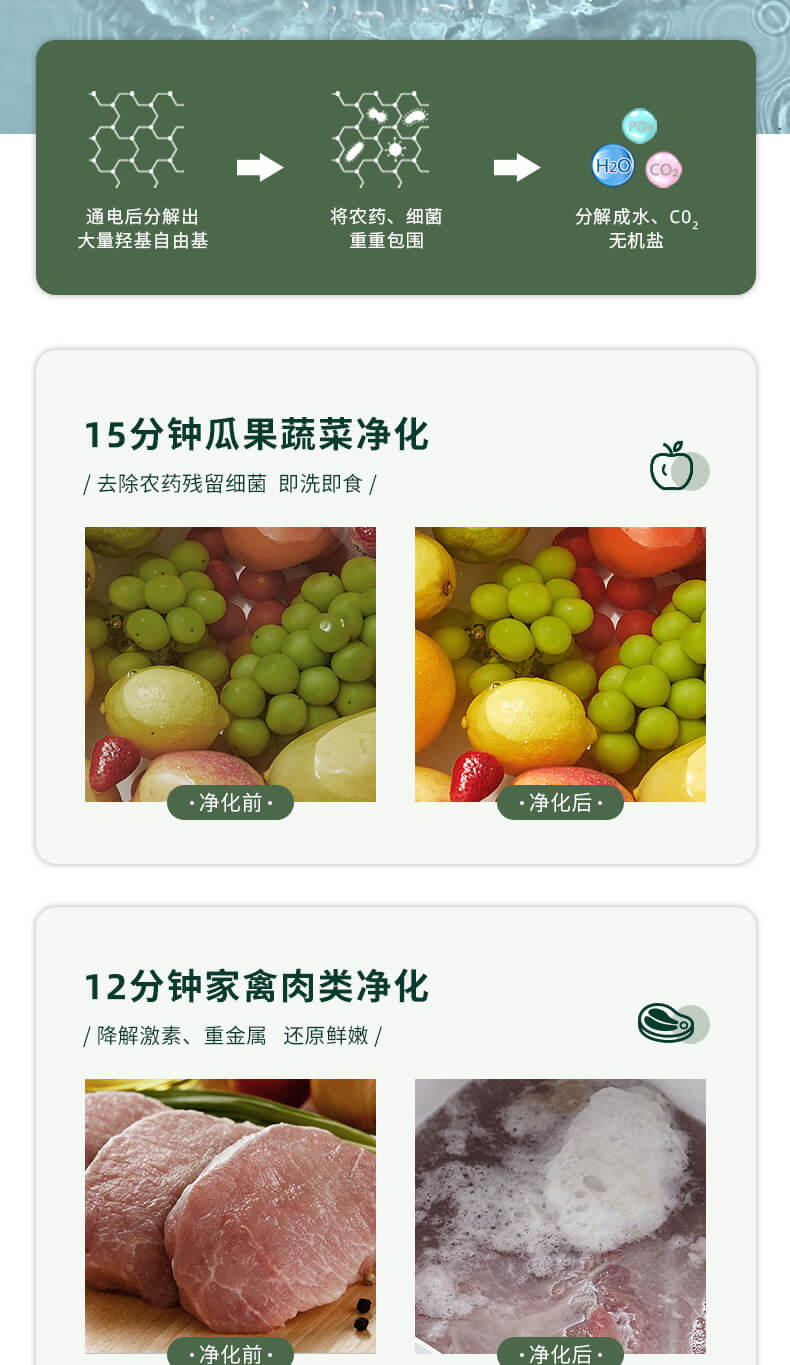 STY23A果蔬清洗凈化機采用加強刀片電極凈化技術、航天級鈦合材質,以水為原料不添加任何化學物質,通電后產生粒子,使水分子裂解為羥基自由基具有強氧化能力,能有效的降解食材表面的細菌、農殘、激素等有害物質。水在離子發生器的作用下分解成OH-和H+;分解的一部分OH-將農藥和細菌細胞壁上的H+奪走并重組,形成無害物質;另一部分OH-和水中氯結合生成次氯酸,通過氧化反應降解殺滅細菌。
